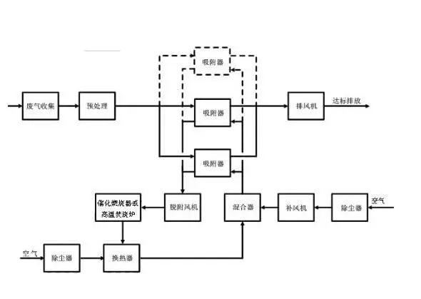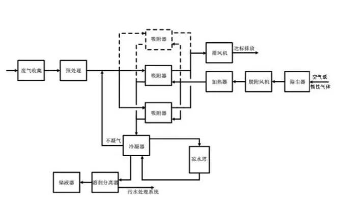 二、 當廢氣中的有機物具有回收價值時,可根據(jù)情況選擇采用水蒸氣再生、熱氣流(空氣或惰性氣體)再生工藝。脫附后產(chǎn)生的高濃度氣體可根據(jù)情況選擇采用降溫冷凝或液體吸收工藝對有機物進行回收。